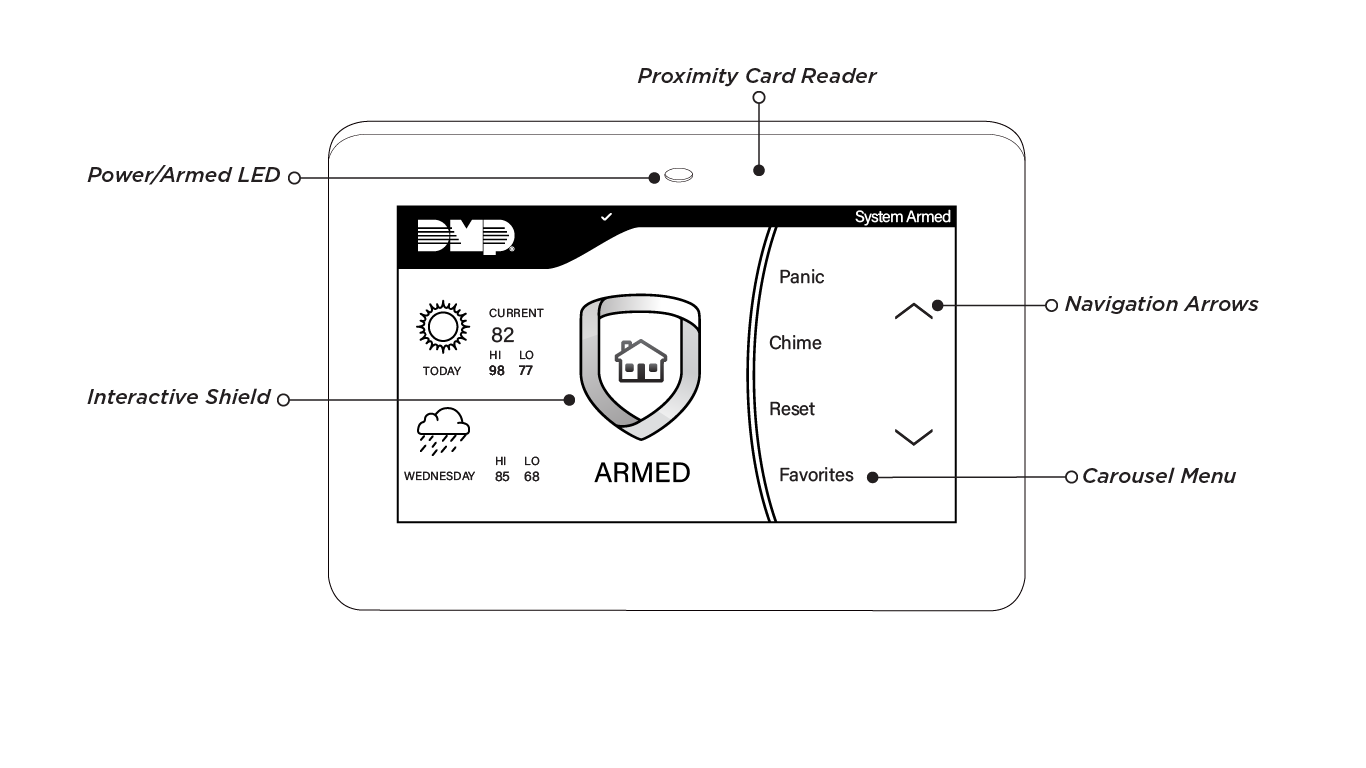 Your keypad provides a built-in proximity card reader located to the right of the power/armed LED. Present your proximity card or keyfob here to disarm your system.
